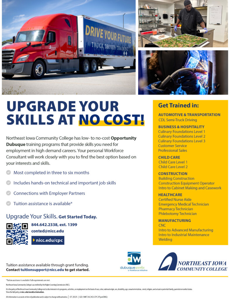 Through Opportunity Dubuque, facilitated by Northeast Iowa Community College, displaced workers can access low- to no-cost training programs designed to lead directly to high-demand careers. Many programs are completed in as little as three to six months and include hands-on learning and employer connections.