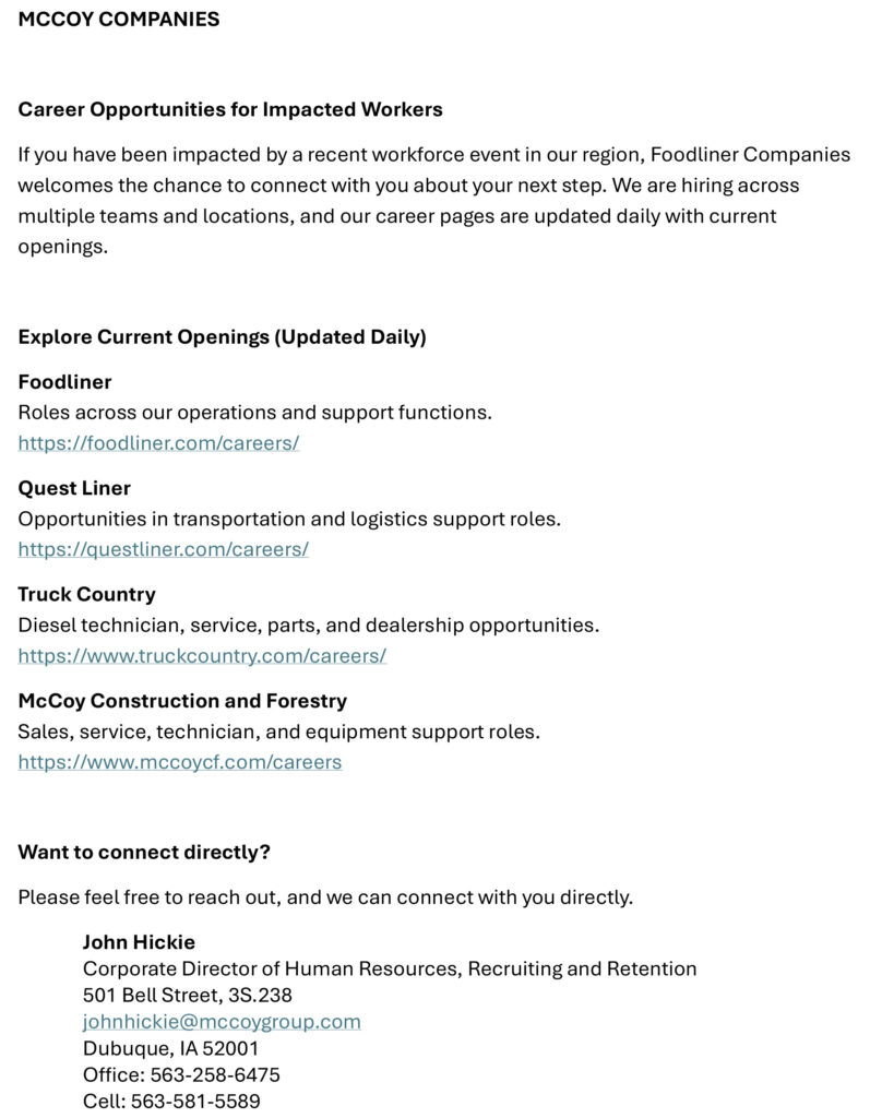 McCoy Companies (including Foodliner, Quest Liner, Truck Country, and McCoy Construction & Forestry) are also hiring across transportation, logistics support, diesel service, equipment, and dealership roles. These opportunities span both hands-on technical work and operational support functions, with direct HR contacts available for impacted workers .